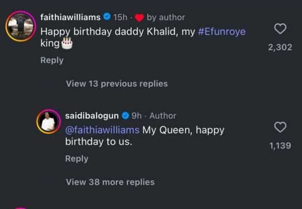 Reacting to Saidi’s birthday post by job of the declare portion, Faithia wrote, “Gay birthday daddy Khalid, my Efunroye king”.