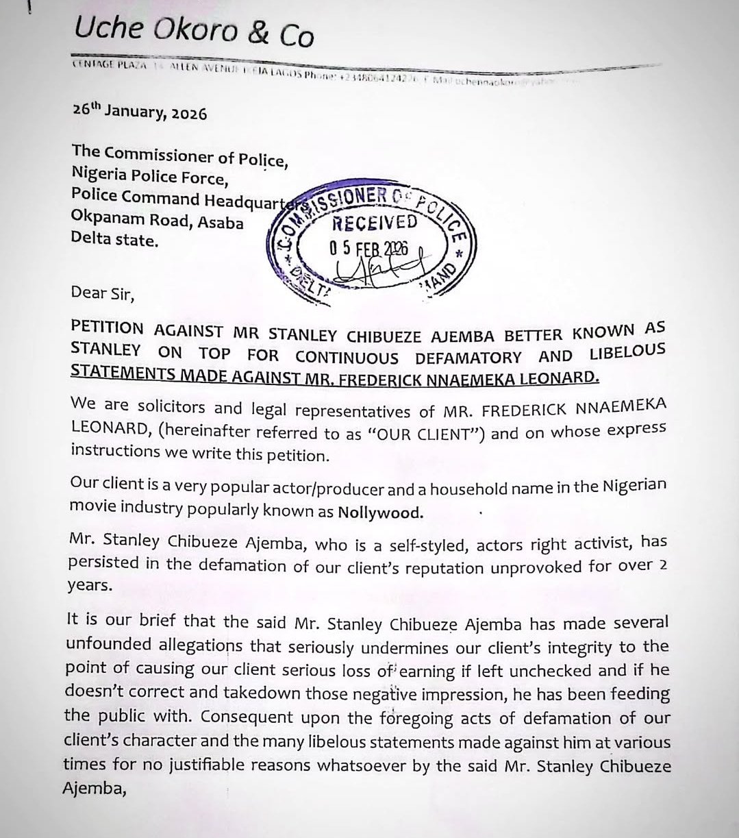 Nollywood actor Frederick Leonard has filed a petition in opposition to filmmaker and media personality Stanley Ontop over alleged defamation of personality.