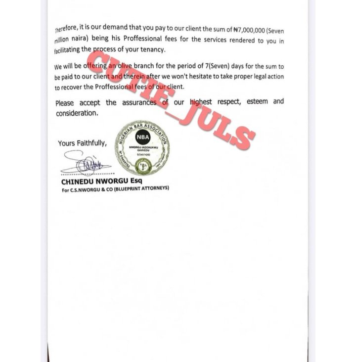 “We’re bowled over and additionally are attempting and fathom why an particular particular person treasure such with a superb persona will withhold the job of livelihood of a firm that has staff who rely on them by no longer paying Proffessional fees accrued to them for a service wisely rendered to you which we accept as true with the service used to be rendered for subsequently, it is our query that you just pay to our client the sum of ₦7,000,000 (Seven million naira) being his Proffessional fees for the companies rendered to you in facilitating the course of of your tenancy.