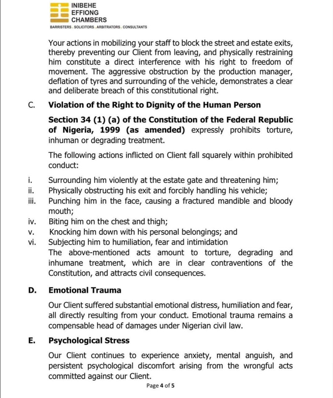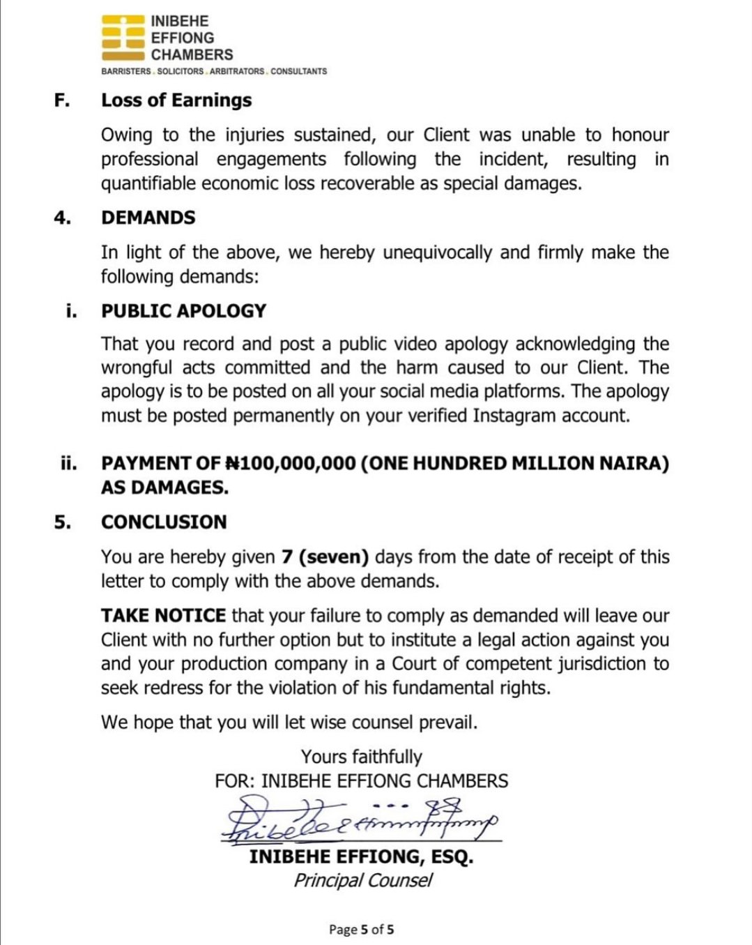 They’re looking out out for a public video apology on all of Ovire’s social media accounts alongside the ₦100 million compensation.