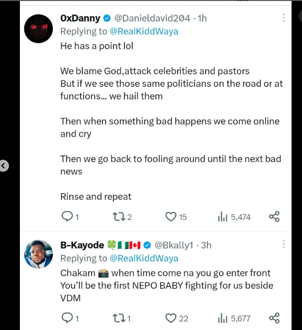 One other 𝕏 user also agreed with Kiddwaya’s point, noting that many Nigerians attack pastors and celebrities nonetheless unruffled praise politicians when they see them in public, only to return online to bitch when things lunge inappropriate.
