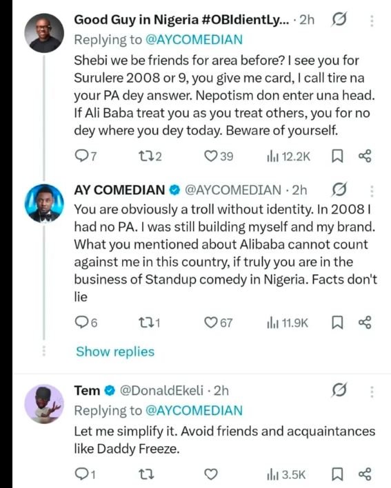 He accused AY of “nepotism” and added, “If Alibaba take care of you as you take care of others, you for no dey the place you dey this day. Beware of yourself.”